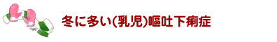 この時期になると、年令が低い子ほど、ひどい下痢をともなったカゼをひくことがあります。 ロタウィルスが原因です。吐いたり下痢したりの症状は、熱のカゼよりも体力の消耗が激しく、回復にも時間がかかります。感染力が強く、また短い潜伏期のため 集団の中で移りやすい病気の一つです。乳児の場合、重症な脱水症状をおこすことがあります。症状のある時は早めに医師の診察を受けて、安静と水分補給に心がけましょう。