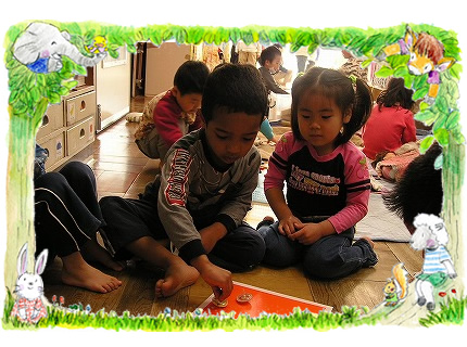 乳児クラスでは、室内での遊びを充実させ1人1人の子どもの発達や要求に応じて遊びの設定を行なっています。