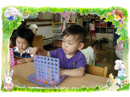 うさぎ組 ばんびさんよりちょっぴり難しいコイン落とし。高〜く高〜く積んでいくよ!