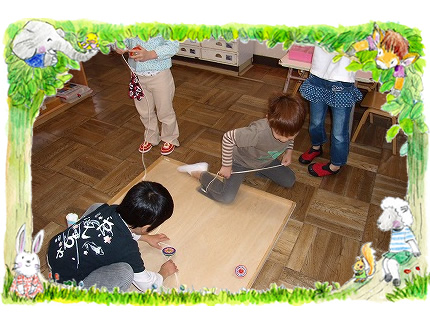 ぞう組 こま回し〜ひもとひもの間にこまをはさみ「橋わたり」の練習中です。