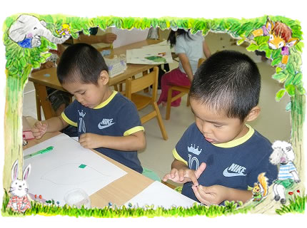 ひつじ組 ちいさなはり紙を貼り合せ、はっぱ製作中! のりづけも上手になりました。