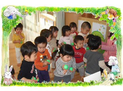 園庭の梅の花が、寒さに負けじと園庭をかけまわる子どもたちを見守っているようです。さすがに2月ともなると雪・・・雪・・・の予報が出て子どもたちもうきうきするものの、積もらずがっかり・・・さて、2月の節分に豆まきを行いました。各クラスの様子をご覧下さい。