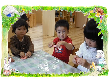 東京はとうとう梅雨入りとなりました。 園庭に降る雨を横目に、室内では体操、わらべ歌、リズム遊びなど様々な活動的な遊びを行い、体を動かし発散させています。 反面、手先を使った遊びも組み入れ、静と動の活動を織り込んだ保育活動を行っています。