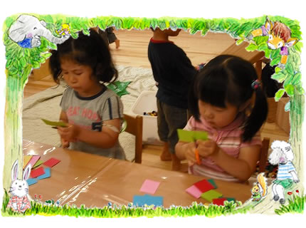東京はとうとう梅雨入りとなりました。 園庭に降る雨を横目に、室内では体操、わらべ歌、リズム遊びなど様々な活動的な遊びを行い、体を動かし発散させています。 反面、手先を使った遊びも組み入れ、静と動の活動を織り込んだ保育活動を行っています。