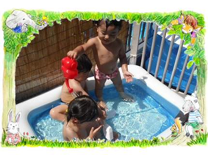 酷暑の今年は心なしかせみの声が少ないように感じています。せみもこの暑さ「たまったもんじゃないよ!」とばかりに・・・ということでもないでしょうが、鉄砲水や森林火災、熱中症など世界のあちこちで起こる災害に、自然からの警鐘を感じざるを得ません。さて、夏といったら「太陽と水と泥」がおりなす開放感たっぷりの遊びに子どもたちはおおはしゃぎです。園庭やベランダで思う存分、満喫しています。