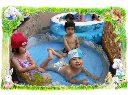 酷暑の今年は心なしかせみの声が少ないように感じています。せみもこの暑さ「たまったもんじゃないよ!」とばかりに・・・ということでもないでしょうが、鉄砲水や森林火災、熱中症など世界のあちこちで起こる災害に、自然からの警鐘を感じざるを得ません。さて、夏といったら「太陽と水と泥」がおりなす開放感たっぷりの遊びに子どもたちはおおはしゃぎです。園庭やベランダで思う存分、満喫しています。