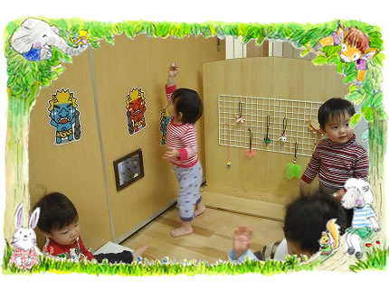 2月3日の豆まきには、保育園に赤鬼と青鬼がやってきました。0才1才は、2階ベランダからの見物です。 小さい子ども達から順に鬼を発見し、大きなクラスに助けを求めるという大人のおもわく通り、子ども達は5才ぞう組さんへ・・・頼りになるぞう組さんは、どきどきしながらも靴を履き、鬼を追い掛け回しとうとう追い出してくれました。ぞうさんってつよいね!ありがと〜!。