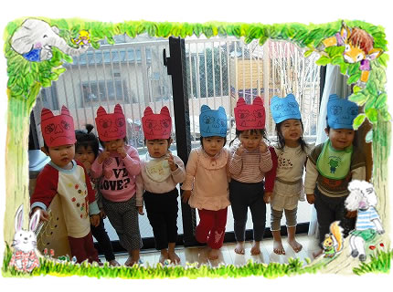 2月3日の豆まきには、保育園に赤鬼と青鬼がやってきました。0才1才は、2階ベランダからの見物です。 小さい子ども達から順に鬼を発見し、大きなクラスに助けを求めるという大人のおもわく通り、子ども達は5才ぞう組さんへ・・・頼りになるぞう組さんは、どきどきしながらも靴を履き、鬼を追い掛け回しとうとう追い出してくれました。ぞうさんってつよいね!ありがと〜!。