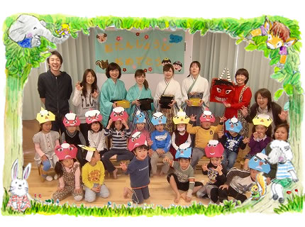 2月3日の豆まきには、保育園に赤鬼と青鬼がやってきました。0才1才は、2階ベランダからの見物です。 小さい子ども達から順に鬼を発見し、大きなクラスに助けを求めるという大人のおもわく通り、子ども達は5才ぞう組さんへ・・・頼りになるぞう組さんは、どきどきしながらも靴を履き、鬼を追い掛け回しとうとう追い出してくれました。ぞうさんってつよいね!ありがと〜!。