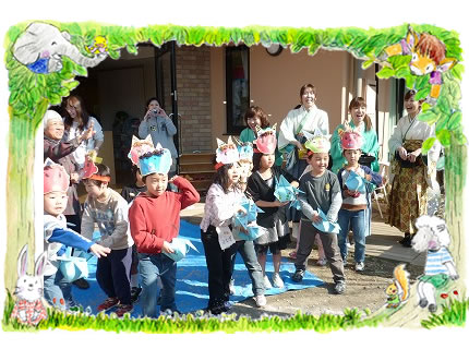 2月3日の豆まきには、保育園に赤鬼と青鬼がやってきました。0才1才は、2階ベランダからの見物です。 小さい子ども達から順に鬼を発見し、大きなクラスに助けを求めるという大人のおもわく通り、子ども達は5才ぞう組さんへ・・・頼りになるぞう組さんは、どきどきしながらも靴を履き、鬼を追い掛け回しとうとう追い出してくれました。ぞうさんってつよいね!ありがと〜!。
