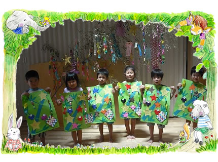 東京もとうとう梅雨が開け 本格的な夏の到来です。 子ども達は、シャワーにプールにと元気いっぱいです。 今年の「七夕」には、 「被災された方々の一日も早い復興を!」と祈るばかりです。 子ども達、そして保護者の方々からも「たんざく」を頂き 微笑ましい願い事に、現実的なお願い・・・等 笹飾りと共に、さらさらと風にたなびいていました。 「どうぞ、願いかかないますように!」