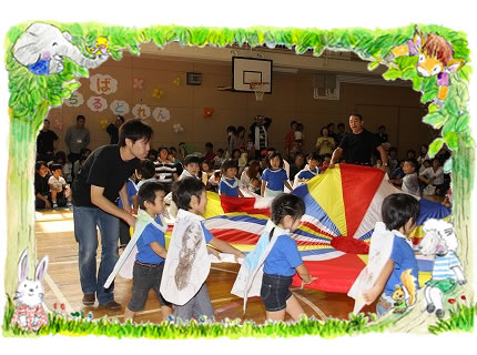 スポーツによし、読書によし、さわやかな秋空が広がります。保育園では、小学校の体育館をお借りして「風の子ひろば」(運動会)を開催いたしました。子どもも、大人も、地域の方々も一緒に楽しめる会を!と様々なプログラムを組んでいます。乳児の子ども達は、ご家族と一緒にわらべ歌等を楽しみました。幼児になると発表する意識もあり、発表を目標に力をつけるチャンスともなります。練習を積み重ね達成感から大きな自信をつけて欲しいと考え3,4,5歳は発表のプログラムを組んでいます。子ども達の満面の笑顔をご覧下さい。