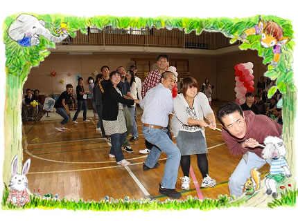 ひつじ 親子で綱引き「がんばれ〜おとな〜」