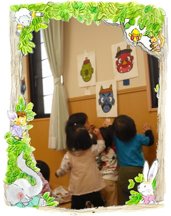 春とは名のみの、まだまだ小雪が舞っております。 インフルエンザが猛威を振るっている中ではありますが、 子ども達は、元気に豆まきをしました。 乳児には乳児にあわせ、ゆるやかに・・・ 幼児はそれにあわせ、力強く・・・ 今年の年長組の子ども達の、力強いこと 小さい子ども達の応援で、鬼を園庭から追い出しました! ありがと〜!