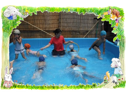 毎日暑い日が続きます。 子ども達は、「水」を十分に体験する、夏ならではの遊びを満喫しています。 「節電の夏」 当園では、20〜30分に1回の水分補給を行い、熱中症の予防をしています。又、汗腺の機能が発達するこの時期に、汗をかくことも必要と考えます。 食事時間と午睡時はクーラーを入れて体調を整え、活動中は外気と室温、湿度との兼ね合いで、 28度が保てるようにクーラーを取り入れています。