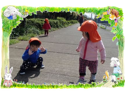 穏やかな日差しの中を、各年令にあわせ、それぞれが散歩に出かけます。 室内や園庭では感じられない、風。そして風や草木の匂いや音。虫や鳥の声や感触。電車や車等。五感をフルに使い、様々な体感が子ども達の身体、感受性を育ててくれることでしょう。