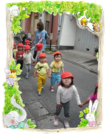穏やかな日差しの中を、各年令にあわせ、それぞれが散歩に出かけます。 室内や園庭では感じられない、風。そして風や草木の匂いや音。虫や鳥の声や感触。電車や車等。五感をフルに使い、様々な体感が子ども達の身体、感受性を育ててくれることでしょう。