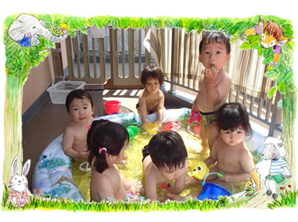 毎日暑い日が続きます。 子ども達は、「水」を十分に体験する、夏ならではの遊びを満喫しています。 「節電の夏」 当園では、20〜30分に1回の水分補給を行い、熱中症の予防をしています。又、汗腺の機能が発達するこの時期に、汗をかくことも必要と考えます。 食事時間と午睡時はクーラーを入れて体調を整え、活動中は外気と室温、湿度との兼ね合いで、 28度が保てるようにクーラーを取り入れています。