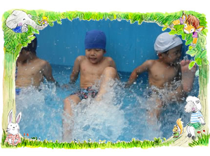 毎日暑い日が続きます。 子ども達は、「水」を十分に体験する、夏ならではの遊びを満喫しています。 「節電の夏」 当園では、20〜30分に1回の水分補給を行い、熱中症の予防をしています。又、汗腺の機能が発達するこの時期に、汗をかくことも必要と考えます。 食事時間と午睡時はクーラーを入れて体調を整え、活動中は外気と室温、湿度との兼ね合いで、 28度が保てるようにクーラーを取り入れています。