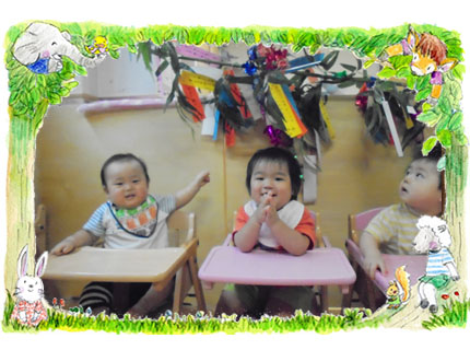 大変お待たせいたしました。H26年度初の発信となります。 今年度は保育園での「行事」のご紹介をさせていただきます。 7月7日の七夕祭りにちなみ、保育園では子どもと保護者の方々の「願い事」を短冊に書いていただき、笹に飾っていただきました。 3,4,5才はそれぞれの笹に、星や、輪つなぎ、ぼんぼりなどを製作して飾り、各ご家庭に飾っていただく為、早めに持ち帰りました。 みんなの「願い事」がかないます様に・・・