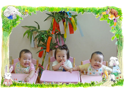 大変お待たせいたしました。H26年度初の発信となります。 今年度は保育園での「行事」のご紹介をさせていただきます。 7月7日の七夕祭りにちなみ、保育園では子どもと保護者の方々の「願い事」を短冊に書いていただき、笹に飾っていただきました。 3,4,5才はそれぞれの笹に、星や、輪つなぎ、ぼんぼりなどを製作して飾り、各ご家庭に飾っていただく為、早めに持ち帰りました。 みんなの「願い事」がかないます様に・・・