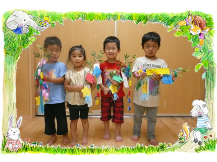 3,4,5才はそれぞれの笹に、星や、輪つなぎ、ぼんぼりなどを製作して飾り、各ご家庭に飾っていただく為、早めに持ち帰りました。